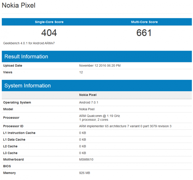 Theo đó, mới đây trên Geekbench đã bất ngờ lộ diện một smartphone của Nokia với tên gọi lạ: “Nokia Pixel”, cảm giác như nó là “anh em” của dòng Google Pixel vậy. Đây sẽ là một smartphone giá rẻ bởi máy chỉ sử dụng vi xử lý Snapdragon 200 tốc độ 1.19 GHz, bộ nhớ RAM chỉ 1 GB nhưng nó vẫn hỗ trợ sạc nhanh Quick Charge 3.0. Đặc biệt hơn nữa là máy chạy trên Android 7.0.1 rất mới mẻ.