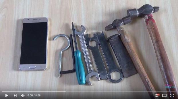 Bước vào bài kiểm tra, chủ nhân của video này đã chuẩn bị dụng cụ theo cấp độ tăng dần: móc khóa => tua-vít => cờ lê => đục =>búa để thử thách chiếc Galaxy J5 Prime. Đầu tiên dùng móc khóa tác động lực lên màn hình của chiếc Galaxy J5 Prime, thậm chí cào bằng mũi nhọn của móc khóa. Âm thanh phát ra giữa những lần va chạm giữa màn hình và các dụng cụ là rất lớn chứng tỏ anh chàng này khá là mạnh tay trong thí nghiệm này.