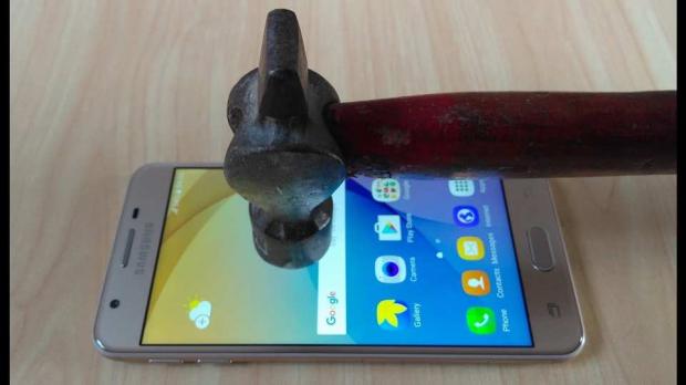 Phần khó khăn nhất cuối cùng đã tới với chiếc Galaxy J5 Prime, thử nghiệm độ cứng của màn hình bằng búa. Nhiều người sẽ nghĩ: “Ôi!! thôi xong rồi” chuẩn bị đưa chiếc máy này vào thùng rác sau lần thử nghiệm này. Nhưng không, thật bất ngờ rằng chiếc Galaxy J5 Prime vẫn sống và hoạt động rất bình thường như chưa hề có việc gì xảy ra. Kiểm tra lại phần màn hình sau khi tất cả thử nghiệm thì không có một vết xước, chỗ nứt nào hiện diện trên mặt kính của chiếc Galaxy J5 Prime.