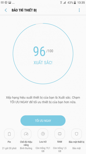- Phần trên: hiển thị mức đánh giá hiệu suất của thiết bị theo thang điểm 100 và một nút nhấn giúp tối ưu nhanh hệ thống. Thông thường, khi chọn nút này, thiết bị sẽ tự động tắt các ứng dụng ngầm, giải phóng bộ nhớ, vô hiệu hóa các ứng dụng đang bị treo hoặc làm ngốn pin,..