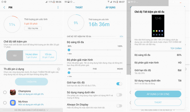 Các chế độ tiết kiệm pin được làm trực quan hơn với 3 nút chế độ gồm tắt, chế độ tiết kiệm trung bình, chế độ tiết kiệm pin tối đa (siêu tiết kiệm). Ở mỗi chế độ tiết kiệm, thiết bị sẽ có phép tùy chỉnh khả năng tiết kiệm năng bằng cách cho người sử dụng tinh chỉnh lại độ sáng tối đa, độ phân giải màn hình, giới hạn hiệu năng sử dụng,… để người dùng có thể đảm bảo thời gian sử dụng pin tốt nhất.