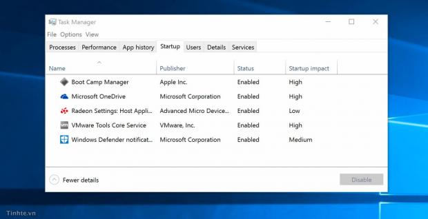 Bấm phải chuột vào thanh Task Bar (hoặc nhấn tổ hợp phím Control + Alt + Delete) Chọn Task Manager, nhấn tiếp vào nút More Detail Trong màn hình mới xuất hiện, các bạn nhấn chọn tab Startup Chọn các ứng dụng không cần thiết, và nhấn nút Disable Nếu sau này bạn muốn thêm ứng dụng nào đó chạy cùng Windows thì hãy làm tương tự, lần này nhất nút Enable.