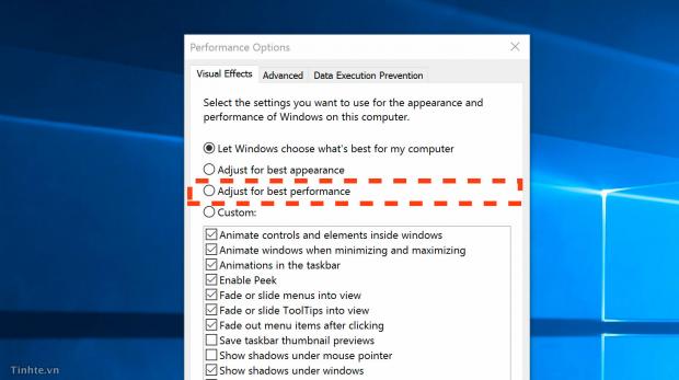 Gõ Performance vào Start Menu Chọn 'Adjust the appearance and performance of Windows' Tắt bớt một số hiệu ứng mà bạn không sử dụng hoặc ông cần tới, có thể lấy ví dụ như hiệ ứng maximize cửa sổ, bóng mờ cho window. Nếu lười chọn từng cái, bạn có thể nhấn vào nút “Adjust for best performance” để Windows tự tắt bớt chúng đi.