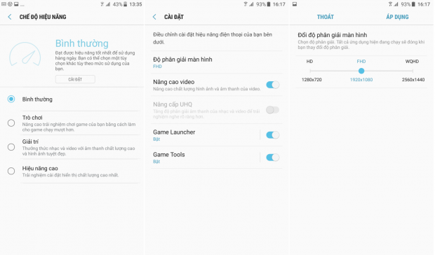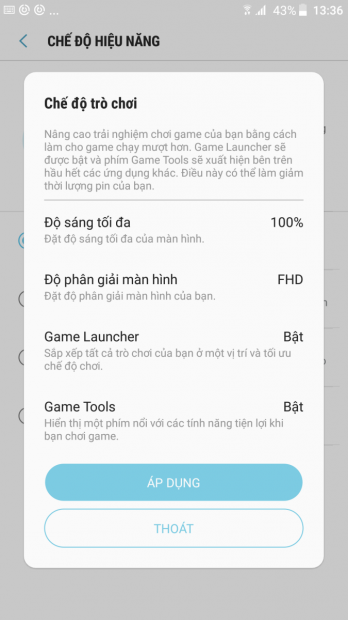 Giúp nâng cao các trải nghiệm chơi game bằng cách bật tính Game Launcher/ Game Tool, đây là các công cụ có sẵn của máy để hỗ trợ và tối ưu hóa trong quán trình trải nghiệm game. Độ sáng được chỉnh lên mức tối đa và phân giải màn hình là FullHD. Ở chế độ này, chắc chắn hiệu suất làm việc của máy sẽ được đẩy lên rất cao để có thể “cân” được các tựa game mạnh.