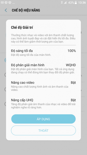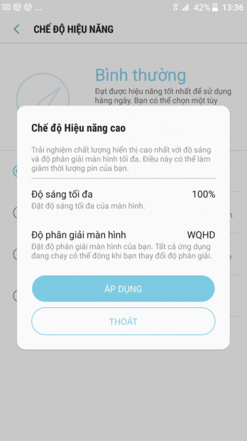 Máy sẽ được vận hành với hiệu suất cao nhất từ hiển thị cho đến hiệu năng sử dụng. Ở chế độ này sẽ thấy được sức mạnh phần cứng mà Samsung đã trang bị cho Galaxy S7. Sau khi chơi một vài tựa game, thì cảm giác máy xuống pin nhanh hơn pin thường và thân máy cũng nóng lên trông thấy. Lời khuyên dành cho người dùng là không nhất thiết phải bật chế độ này lên. Vì hiện tại, cấu hình Galaxy S7 đã quá mạnh để chiến hầu hết các game trên CH Play ở mức maximum setting mà không cần phải chọn “chế độ hiệu năng cao”.