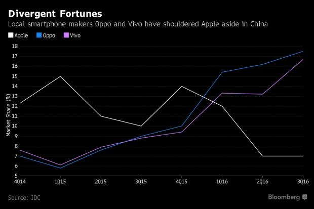 OPPO và Vivo đã xuất xưởng khoảng 40 triệu smartphone trong quý 3/2016, chiếm 34% tổng số smartphone được bán ra tại thị trường lớn nhất thế giới, theo IDC. Trong năm 2012, tổng thị phần của hai hãng này chỉ đạt khoảng 2,5%. Doanh số iPhone giảm hơn 1/3, xuống mức 8,2 triệu chiếc trong cùng thời kỳ, chưa bằng một nửa của Vivo. Samsung, từng một lần dẫn đầu thị trường, bây giờ chỉ chiếm khoảng 5% thị phần, theo Counterpoint.
