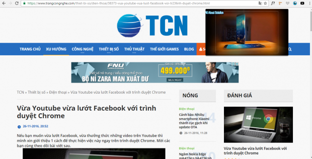 Ngay lập tức, video sẽ thu gọn lại 1 góc để bạn có thể vừa xem, vừa lướt web hay online Facebook một cách dễ dàng.