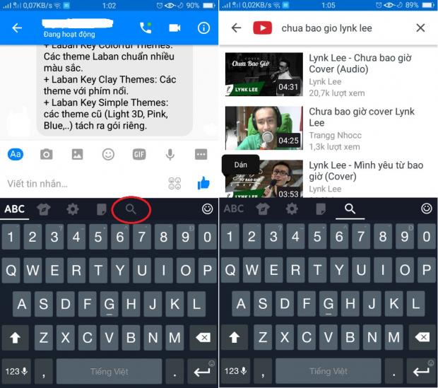 Mình sẽ ví dụ cách chia sẻ video Youtube qua tin nhắn bằng Messenger ngoài ra bạn còn có thể chia sẻ bất kì phương thức nhắn tin nào cũng được. Việc đầu tiên, bạn phải chọn vào biểu tượng hình kính lúp như mình đã khoanh tròn.