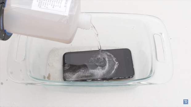 Sau 12 tiếng “đằm mình” trong acid Fluoroantimonic dạng tinh thể, phần mặt lưng của chiếc iPhone 7 đã bị biến dạng với các vết sần sùi trông rất là thê thảm. Chưa dừng lại ở đó, TechRax còn đổ thêm dung dịch oxy già và acid Sulfuric lên chiếc iPhone này khiến nó sủi lên nhìn rất là kinh.