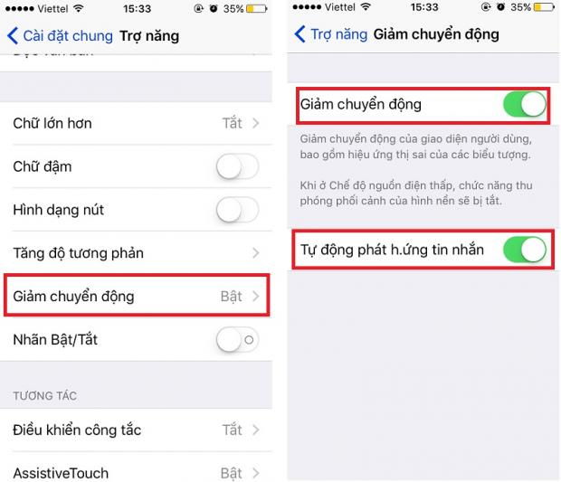 Bước 2: Cài đặt > Trợ năng > Giảm chuyển động > Kích hoạt 'Giảm chuyển động' và 'Tự động phát hiệu ứng tin nhắn'.