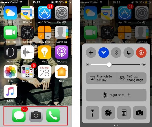 Bước 4: Tại màn hình chính, kéo tay từ mép dưới màn hình lên để mở 'Trung tâm thông báo' > Thả tay ra và nhấn giữ 1 lần nữa vào trung tâm thông báo rồi kéo lên trên để lộ ra ứng dụng trên thanh Dock bên dưới > Nhấn nhanh vào nút Home để quay lại màn hình chính.