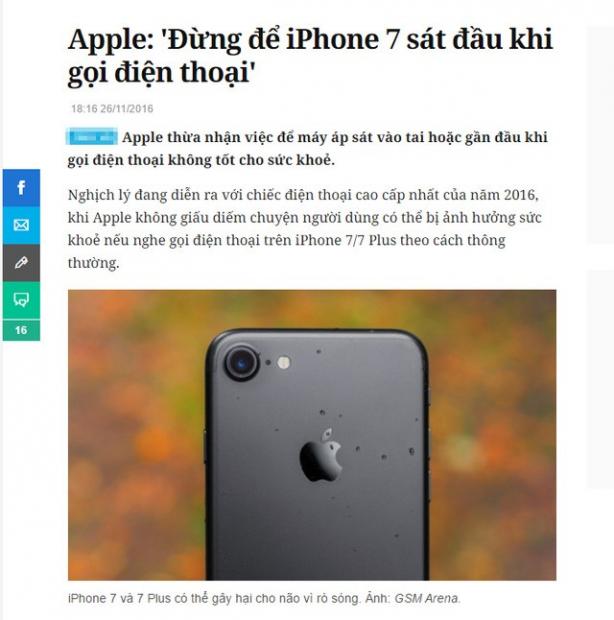 Trong những ngày qua, nhiều website công nghệ ở trong nước cũng như quốc tế đã đồng loạt đưa tin Apple cảnh báo người dùng không để điện thoại sát đầu khi gọi để tránh những ảnh hưởng của tấn số vô tuyến (RF) đến sức khỏe. Các nguồn tin này còn khẳng định chắc nịch rằng iPhone 7 model A1778 phần lớn xách tay từ Singapore, Úc,… đang bị dính nghi án “rò sóng” như thể đây là một “phốt” lớn của Apple trong năm nay. Tuy nhiên, thực tế thì không phải như vậy và Apple cũng chưa bao giờ đề cập đến điều này trên website chính thức của mình.