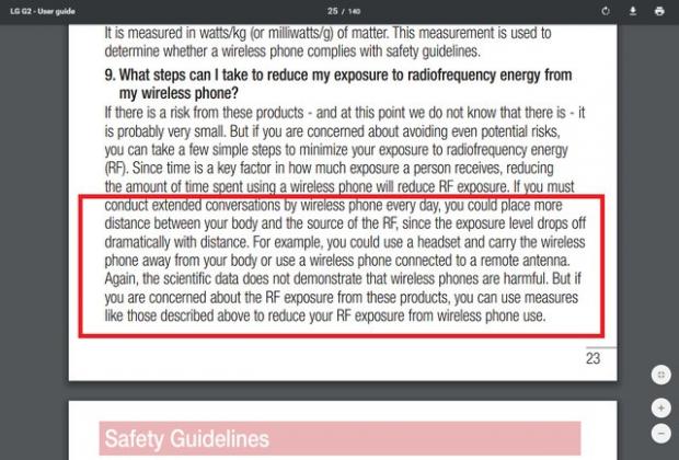 LG cũng không phải là ngoại lệ khi đưa ra lời khuyên về việc hạn chế ảnh hưởng của sóng RF trong cuốn User Guide.