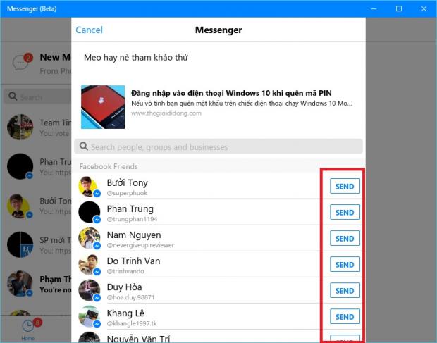 Bước 3: Lúc này ứng dụng Facebook Messenger được mở ra, bạn chỉ cần chọn bạn bè và nhập nội dung vào để hoàn tất quá trình chia sẻ.