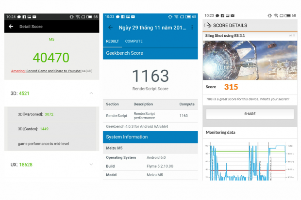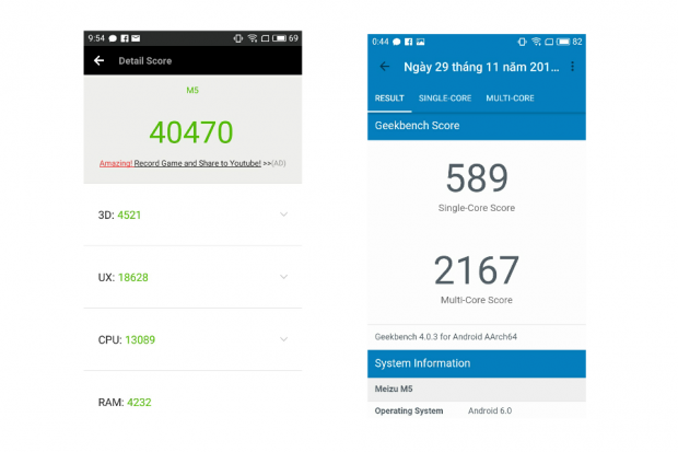 Qua các công cụ chấm điểm hiệu năng thông dụng như: AntutuBenchmark và Geekbenchmark 4. Điểm số cho ra khá là cao với ứng dụng AntutuBenchmark: 40470 điểm. Đây là một điểm số khá cao với một con chip giá rẻ. Tiếp đến là ứng dụng Geekbench 4 để kiểm tra chi tiết hơn về tốc độ xử lý của CPU. Điểm số của Meizu M5 với đơn nhân (SingleCore) đạt 589 điểm và điểm đa nhân (MultiCore) đạt 2167. Thông qua thông số của Geekbench 4, ta thấy tốc độ xử lý đơn nhân của Meizu M5 không được cao. Tuy nhiên, với điểm đa nhân thì máy chứng tỏ sức mạnh của con chip 8 nhân với điểm số đạt gấp gần 4 lần.