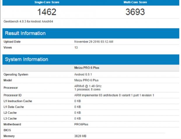 Theo nguồn tin thừ trang Phonearena, Meizu Pro 6 Plus có số điểm đơn nhân và đa nhân lần lượt là 1.462 và 3.693. Thiết bị này sẽ được trang bị bộ vi xử lý 8 nhân, xung nhịp thử nghiệm 1.48 GHz RAM 4GB và hoạt động trên nền Android 6.0.1. Khá đáng tiếc khi một sản phẩm mới nhưng chỉ được hoạt động trên nền Android 6 mà không phải Android 7. Hậu tố “Plus” được đặt trong tên sản phẩm này khiến chúng ta liên tưởng đến một phiên bản phóng lớn của Meizu Pro 6.