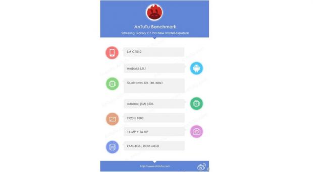 Hôm nay, Samsung Galaxy C7 Pro tiếp tục xuất hiện trên dữ liệu điểm chuẩn của AnTuTu cho thấy máy sử dụng chip Qualcomm và có camera trước lên tới 16MP.