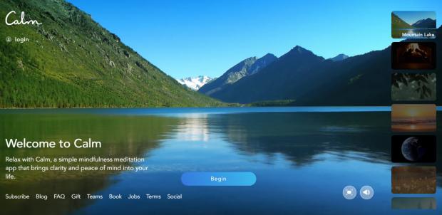 Bạn có thể truy cập vào trang web Calm.com hoặc tải về ứng dụng trên điện thoại để có được không gian của sự bình yên và thiên nhiên hoang dã. Tại đây, bạn có thể hoà mình vào thiên nhiên hoang dã, tiếng nước chảy, cỏ cây, hoa lá. Ngoài ra, Calm còn cho phép bạn lựa chọn khoảng thời gian thư giản như 2 phút, 5 phút,...