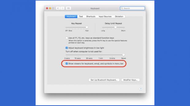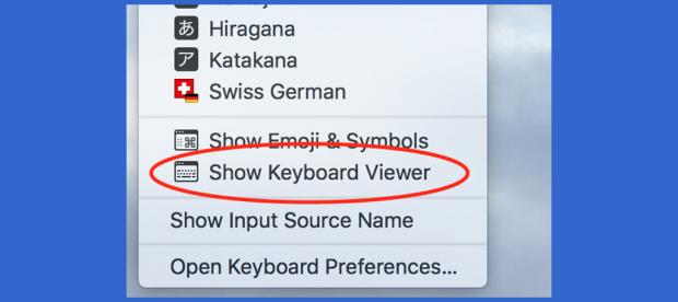 Để kích hoạt bàn phím ảo bạn vào 'System Preferences' > chọn 'Show viewers for keyboard, emoji, and symbols in menu bar.'