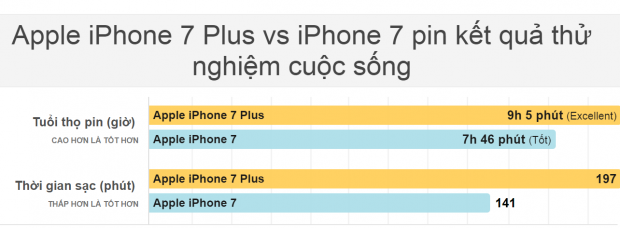 Thời gian sạc và thời gian sử dụng thực tế trên iPhone 7 và iPhone 7 PlusHy vọng, những lời đóng góp trên có thể giúp bạn có sự lựa chọn đơn giản hơn và không hối tiếc với quyết định của mình khi chọn mua iPhone 7 hoặc 7 Plus.