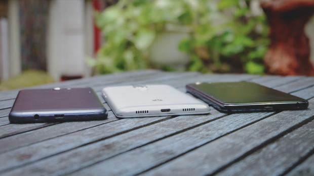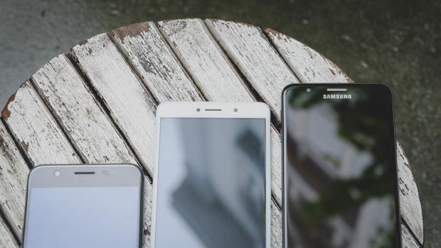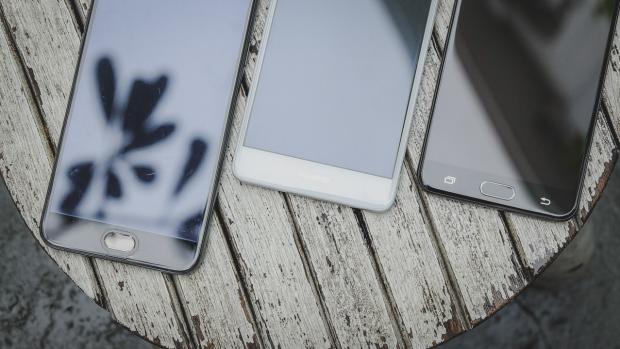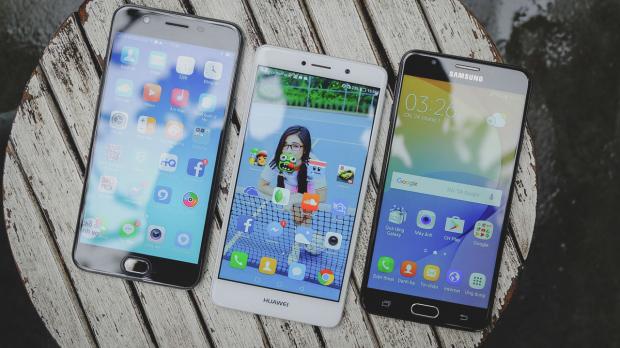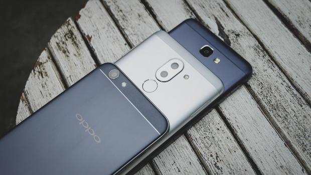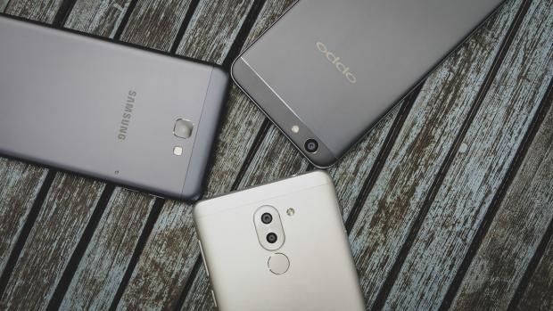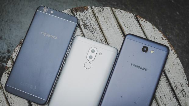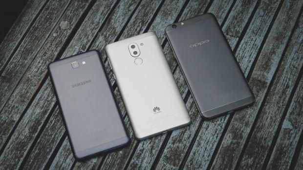 Nhìn ảnh các bạn cũng có thể thấy J7 Prime và F1s không có quá nhiều điểm khác nhau về thiết kế. Từ màu sắc, vị trí đặt logo, các góc được bo cong mềm mại. Riêng Huawei GR5 2017 nổi bật hơn bởi cụm camera kép được đặt lồi lên khá nhiều.