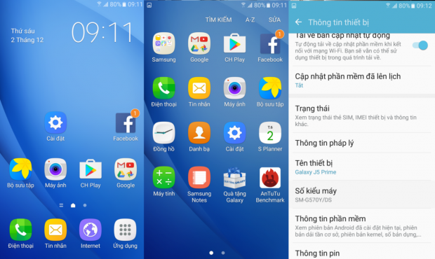Trước tiên sơ lược lại về thông số cấu hình của J5 Prime. Máy có màn hình 5 inch HD cùng bộ vi xử lý 4 nhân xung nhịp 1.4GHz, chip đồ họa GPU Mali-T720 và có 2GB RAM kèm bộ nhớ trong 16GB. Máy đang chạy giao diện TouchWiz truyền thống trên nền tảng Android 6.0.1 Marshmallow.