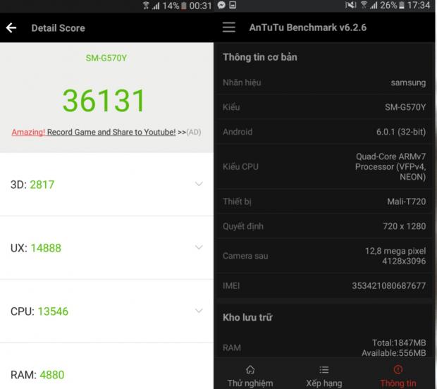 Đầu tiên chúng ta thử với ứng dụng Antutu Benchmark để đo hiệu năng tổng thể máy thì J5 Prime đạt 36131 điểm. Trong đó điểm 3D đạt 2817, điểm UX đạt 14888, điểm CPU đạt 13546 và điểm RAM đạt 4880.
