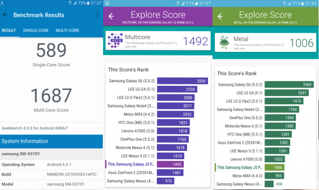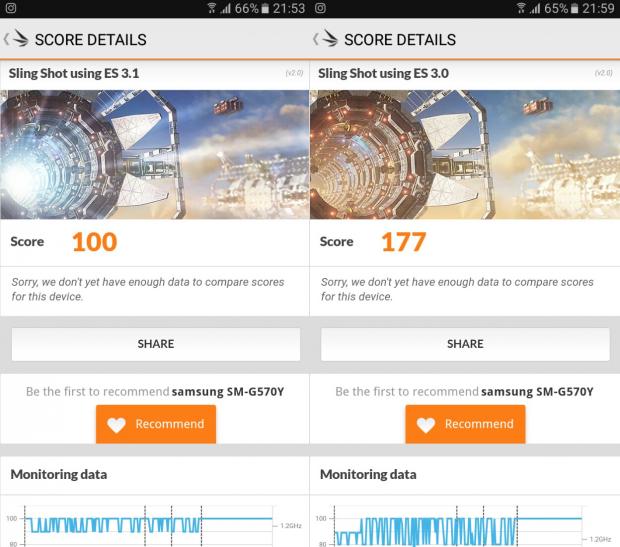 Sau cùng thì dùng ứng dụng 3DMark để có thể đo xử lý đồ họa. Với phép thử Slingshot 3.1 J5 prime đạt 100 điểm trong khi với Slingshot 3.0 thì đạt 177 điểm.