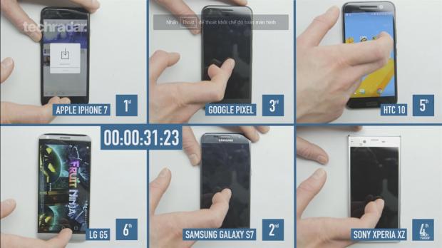Techradar vừa đưa ra kết quả bài thử nghiệm so kè tốc độ giữa iPhone 7 với hàng loạt các siêu phẩm đình đám đến từ Android như: Samsung Galaxy S7, Google Pixel, HTC 10, LG G5, Sony Xperia XZ.