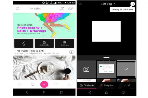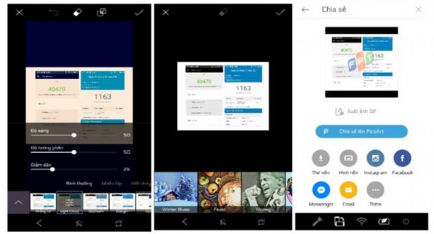 Ở các lựa chọn chức năng xử lý hình nâng cao như “phép thuật” (giúp tạo bức ảnh theo phong nền có sẳn), “hiệu ứng” (giúp tạo hiệu ứng màu cho hình ảnh theo ý thích của người dùng) đều có nét đặc sắc riêng và đều có chế độ chỉnh tay để cho ra màu sắc đẹp hơn cho bức ảnh. Sau khi hoàn thành xong bạn nhấn vào nút mũi tên trắng phía trên bên tay trái như bước chọn phông nền ở trên để lưu ảnh. PicsArt cho phép bạn lưu ảnh với nhiều cách khác nhau như chia sẽ trên Instagram, Facebook, gửi qua messenger và dĩ nhiên là có cả ổ cứng điện thoại của bạn.