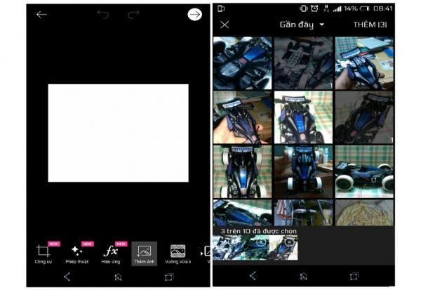 Khi ứng dụng hiện lên tấm nền bạn đã chọn, bạn nhất tiếp vào nút thêm ảnh để chọn ảnh mà bạn mún ghép được lưu trong máy. Nó sẽ hiện ra danh sách gần đây nhất mà bạn dùng để tương tác với ứng dụng