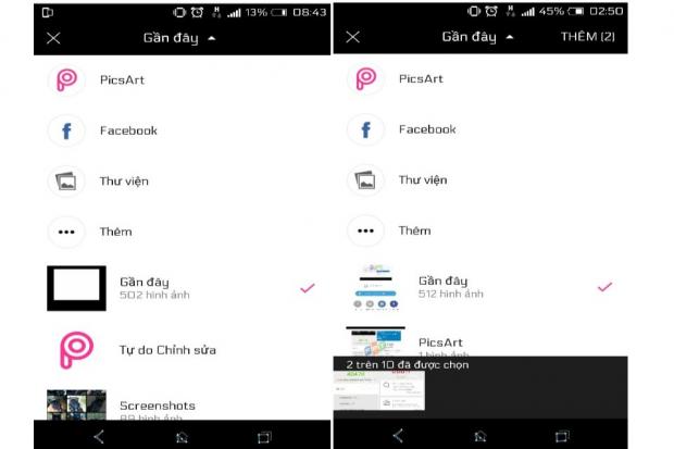 Nếu bạn mún chọn ảnh từ chổ lưu khác thì bạn nhấn vào chữ “gần đây' ở phía trên ứng dụng nó sẽ hiện ra một bảng trắng với các nơi lưu trử hình ảnh của bạn như thư viện, Facebook. Khi bạn chọn hình thì phía dưới sẽ hiện lên những tấm hình bạn chọn và số lượng những tấm hình ấy. Bạn có thể bỏ lựa chọn bằng cách nhấn nút “x” nhỏ phía trên bên trái của hình đã chọn.