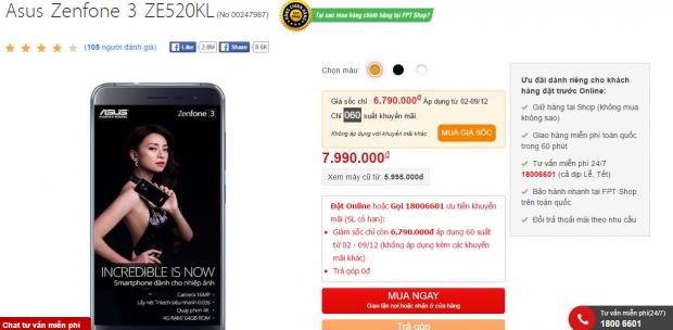 Cụ thể, Asus ZenFone 3 đang được giảm giá từ 7.99 triệu xuống còn 6.79 triệu đồng, giảm 1.2 triệu đồng. Các bạn cần lưu ý là chương trình chỉ áp dụng từ ngày 2/12 – 9/12 với 60 suất mà thôi, vì vậy bạn phải nhanh tay lên nhé kẻo hết thời gian khuyến mãi.