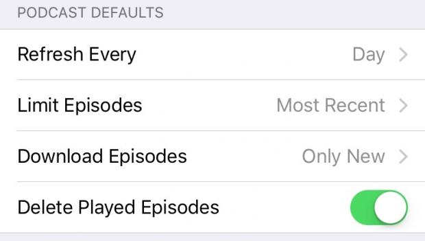 Để xóa được nội dung trong ứng dụng Podcasts, bạn chọn Settings/ Podcasts/ bật Delete Played Episodes. Sau đó ở hai tùy chọn là Download Episodes và Limit Episodes thì bạn thiết lập lần lượt Only New và Most Recent.