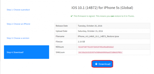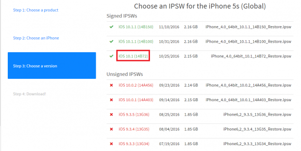 Khi chọn đúng trang web sẽ xuất hiện các phiên bản Firmwave iOS trong đó mới nhất là iOS 10.1.1 và iOS 10.1. Lựa chọn phiên bản iOS 10.1 để tải về.