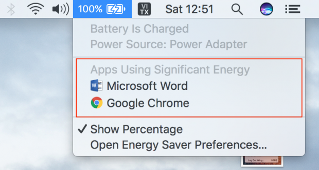 Bên cạnh hai cách trên, bạn có thể sử dụng mẹo kiểm tra xem những ứng dụng nào đang tiêu tốn nhiều pin nhất trên chiếc máy của bạn. Việc kiểm tra cũng khá đơn giản, bạn chỉ việc bấm vào biểu tượng pin trên Menu Bar, khi đó nó sẽ xổ xuống một danh sách và hiển thị cho bạn biết những ứng dụng nào đang tiêu tốn nhiều pin nhất, bạn chỉ việc tắt nó đi để tiết kiệm pin hơn.