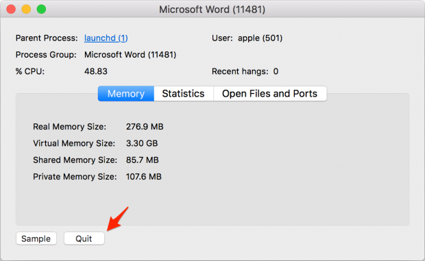 Ở đây, có thể thấy là ứng dụng Microsoft Word đang tiêu tốn đến 53,6% xử lý của CPU, do vậy bạn có thể tắt đi để tiết kiệm pin hơn. Để tắt, bạn chỉ việc nháy đúp chuột vào ứng dụng đó và chọn Quit: