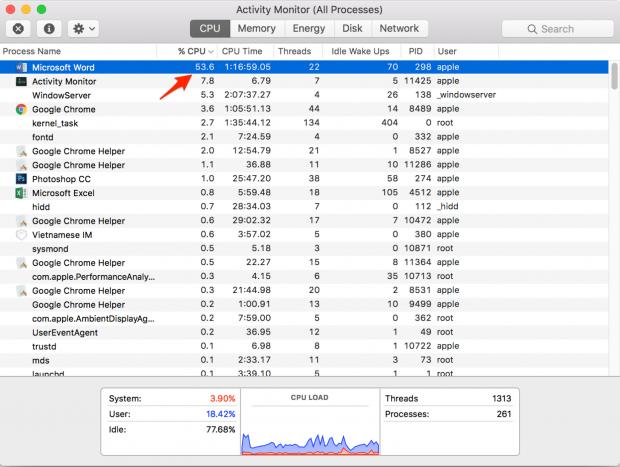 Trước tiên, bạn bật thanh tìm kiếm Spotlight (có thể kích hoạt nhanh bằng tổ hợp phím Cmd + Space), gõ “Activity Monitor” và Enter. Sau đó, trình quản lý “Activity Monitor” hiển thị ra, bạn lựa chọn mục CPU. Khi đó, bạn có thể thấy rõ được những ứng dụng nào đang tiêu tốn xử lý của CPU nhiều nhất (xếp từ cao xuống thấp):
