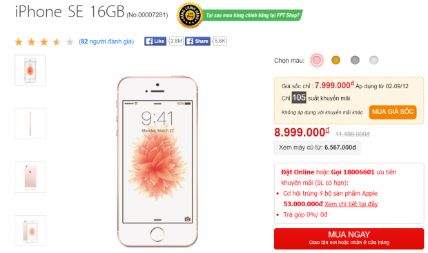 Hiện iPhone SE phiên bản 16GB đang có giá bán chính hãng hấp dẫn là 7.999.000 VNĐ khi bạn đặt mua Online sản phẩm này tại hệ thống FPTShop từ nay tới ngày 9/12 nhân sự kiện Online Friday. Lưu ý là số lượng máy áp dụng mức giá này có hạn và không áp dụng kèm khuyến mãi khác. Hãy nhanh tay lên bạn nhé!