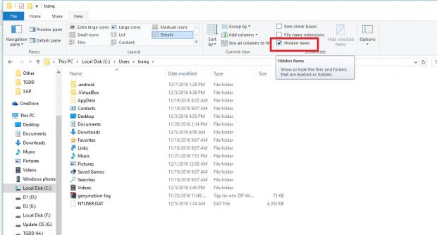 Bước 2: Tại đây bạn chọn thẻ View (góc phải phía trên) > Click chọn Hidden Items.