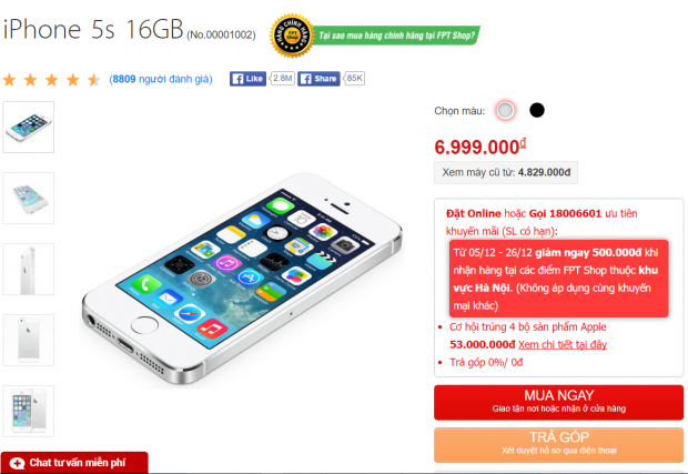 Từ ngày 5/12 tới ngày 26/12, hệ thống FPTShop sẽ giảm ngay 500.000 VNĐ khi bạn đặt mua Online sản phẩm iPhone 5s 16GB và nhận hàng tại các điểm FPTShop thuộc khu vực Hà Nội (không áp dụng kèm các khuyến mãi khác). Đây là một cơ hội tuyệt vời đối với những người khao khát sở hữu một chiếc iPhone mới chính hãng từ lâu mà chưa có điều kiện tài chính để mua máy. Đừng chần chừ nữa nhé!