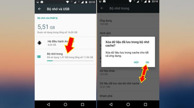 Đây là cách giải phóng bộ nhớ cực hiệu quả giúp bạn thoát khỏi tình trạng không còn không gian lưu trữ. Để thực hiện việc này, bạn truy cập vào cài đặt/ chọn bộ nhớ và USB/ bộ nhớ trong/ xóa Cache/ OK là xong.