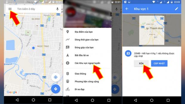 Để xóa dữ liệu, mở Google Maps/ Tùy chọn/ Khu vực ngoại tuyến/ chọn dữ liệu muốn xóa.