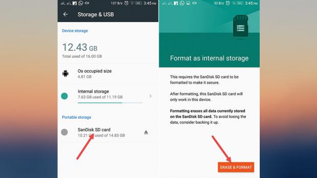 Từ thời Android 6.0 Marshmallow, người dùng đã có thể sử dụng thẻ SD như bộ nhớ trong, tuy nhiên, việc làm này cũng có những yêu cầu khá rắc rối như thẻ nhớ phải được mã hóa hoặc định dạng lại trước khi dùng. Do vậy, nếu tháo thẻ nhớ, người dùng cần phải sao lưu an toàn nếu không sẽ bị mất hết dữ liệu.