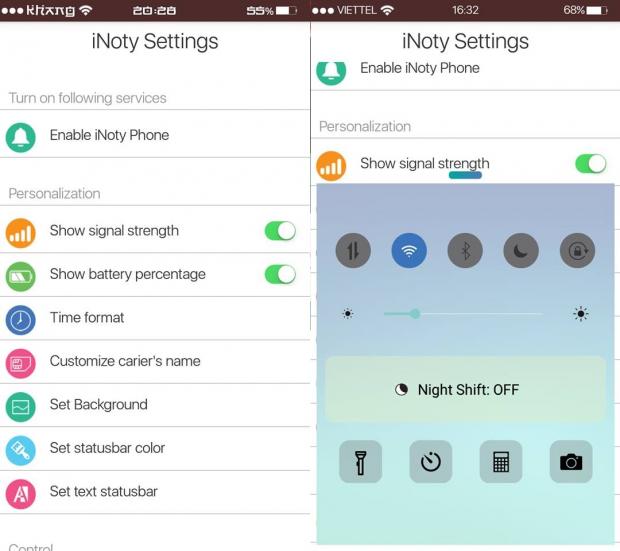 Đây có lẽ là một ứng dụng khá quen thuộc với nhiều bạn yêu thích thanh trang thái của iPhone, và muốn mang lên chiếc android của mình. iNoty có rất nhiều tuỳ chọn cho bạn có thể tuỳ biến như thay đổi tên nhà mạng, hình nền, màu thanh trạng thái,... Ngoài ra, ứng dụng còn có một bộ smart control đi kèm để người dùng có thể thao tác nhanh như trên iOS.