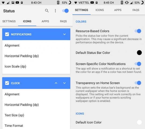 Tương tự như Material Status Bar, Status cũng cho phép bạn tuỳ chỉnh thanh trạng thái theo phong cách phẳng. Tuy nhiên người dùng có thể tuỳ biên rất sâu cho thanh status của mình. Cụ thể, bạn có thể đổi lại các biểu tượng, sắp xếp lại vị trí của các icon, màu sắc,... Rất hữu ích và tiện lợi.