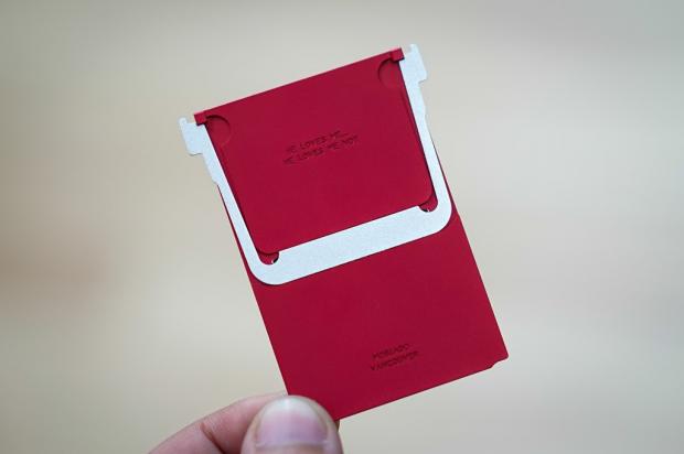 Tương tự nhiều sản phẩm khác của Mobiado, người dùng chỉ cần bấm vào 2 bên để mở nắp lưng. Bên trong vẫn là 1 câu trích dẫn truyền cảm hứng bất kỳ. Dòng chữ 'He loves Me ... He loves me not' được im chìm dưới tấm kim loại màu hồng.