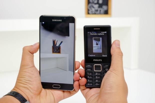 Sau khi đã cài ứng dụng BTNoitification mình đã nói ở trên và kết nối 2 thiết bi với nhau qua Bluetooth, bạn vào mục Bluetooth Partner trên Philips E170 và chọn tính năng Remote Capture, máy sẽ đưa bạn đến với giao diện camera. Đồng thời chiếc smartphone còn lại cũng sẽ truy cập vào ứng dụng camera ngay lập tức. Và khi bạn bấm Capture (Chụp) trên Philips E170, smartphone cũng sẽ chụp theo tức thì.