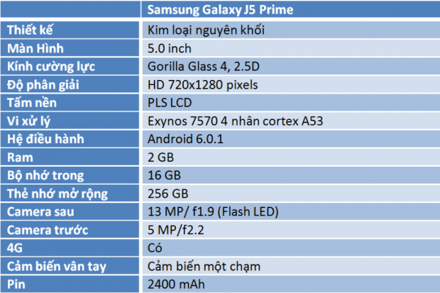 Bảng thông tin cấu hình Samsung Galaxy J5 prime: