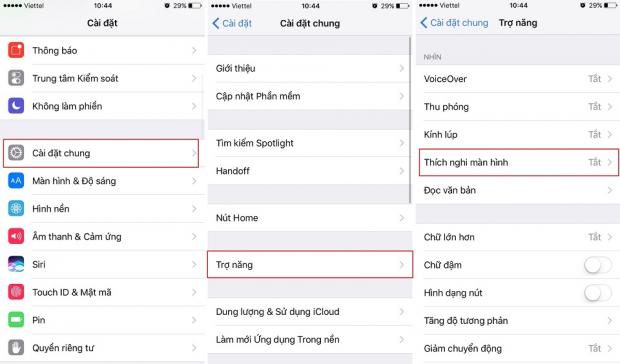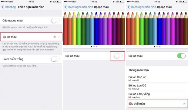 Để kích hoạt tính năng này, bạn vào Cài đặt > Cài đặt chung> Trợ năng > Thích nghi màn hình > Bộ lọc màu, sau đó bạn kích hoạt Bộ lọc màu và chọn Săc thái màu theo chỉ dẫn dưới đây.